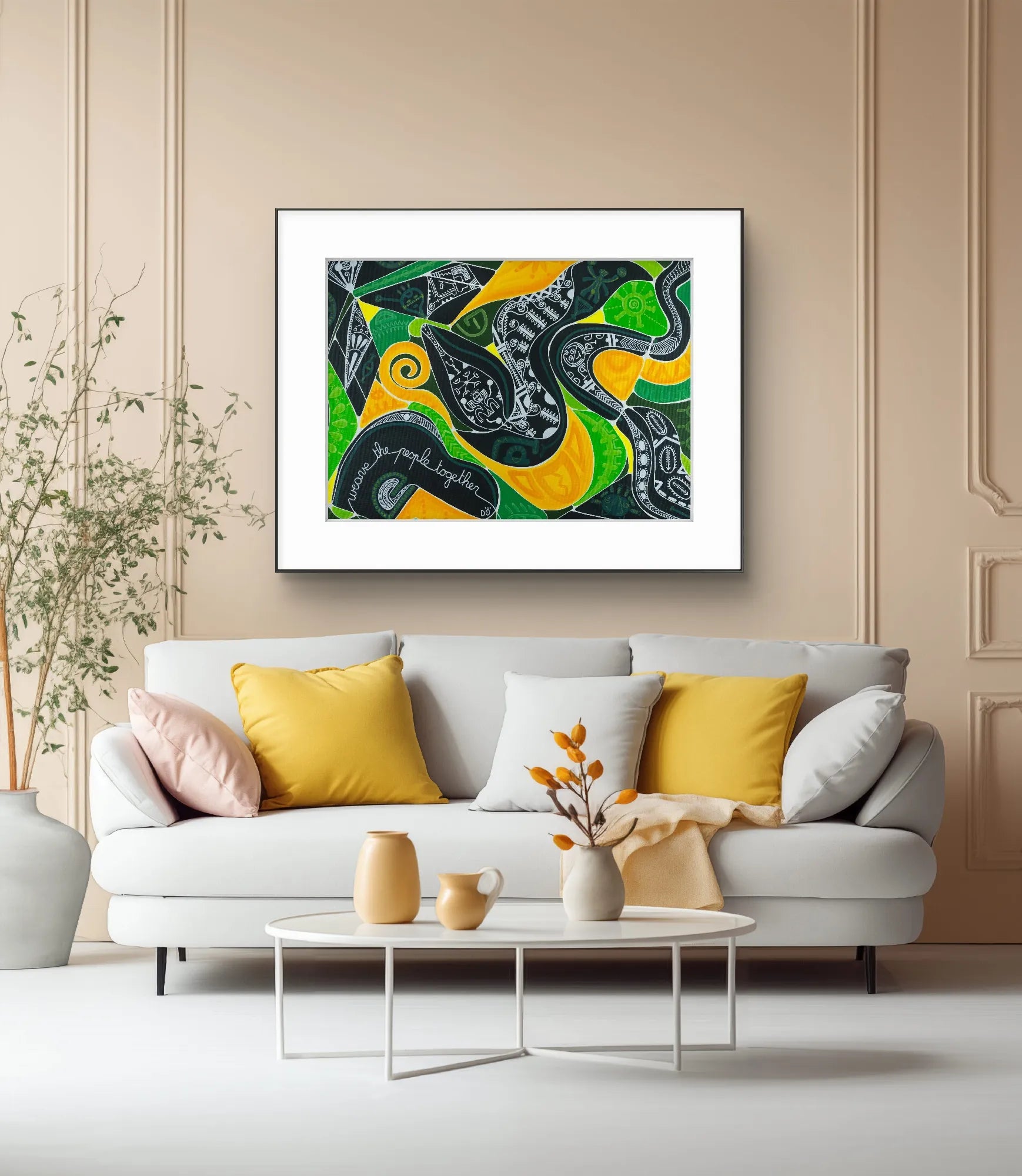 In vibrant shades of green and yellow, the artwork flows like woven patterns, echoing the ancestral spirit of Polynesia where community, nature, and spirit are inseparable.