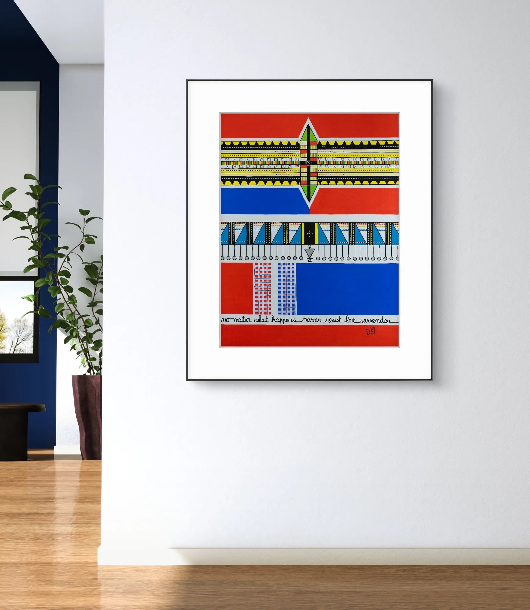 The phrase written on the canvas, “No matter what happens, never resist but surrender,” is an invitation to let go of fear and control, and to trust the flow of life. It reminds us that surrendering is not weakness, but the key to resilience and transformation.