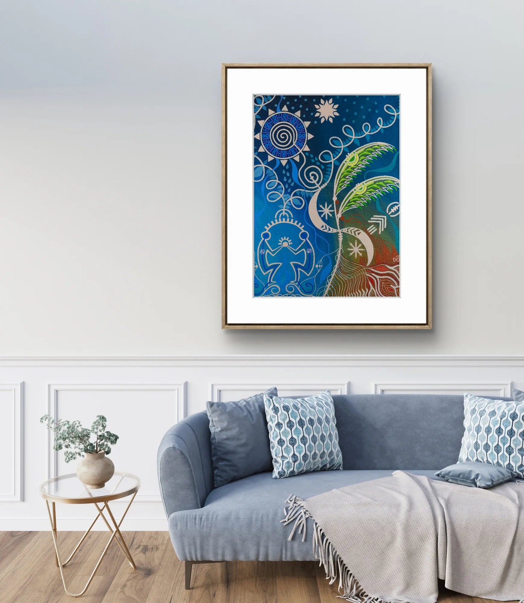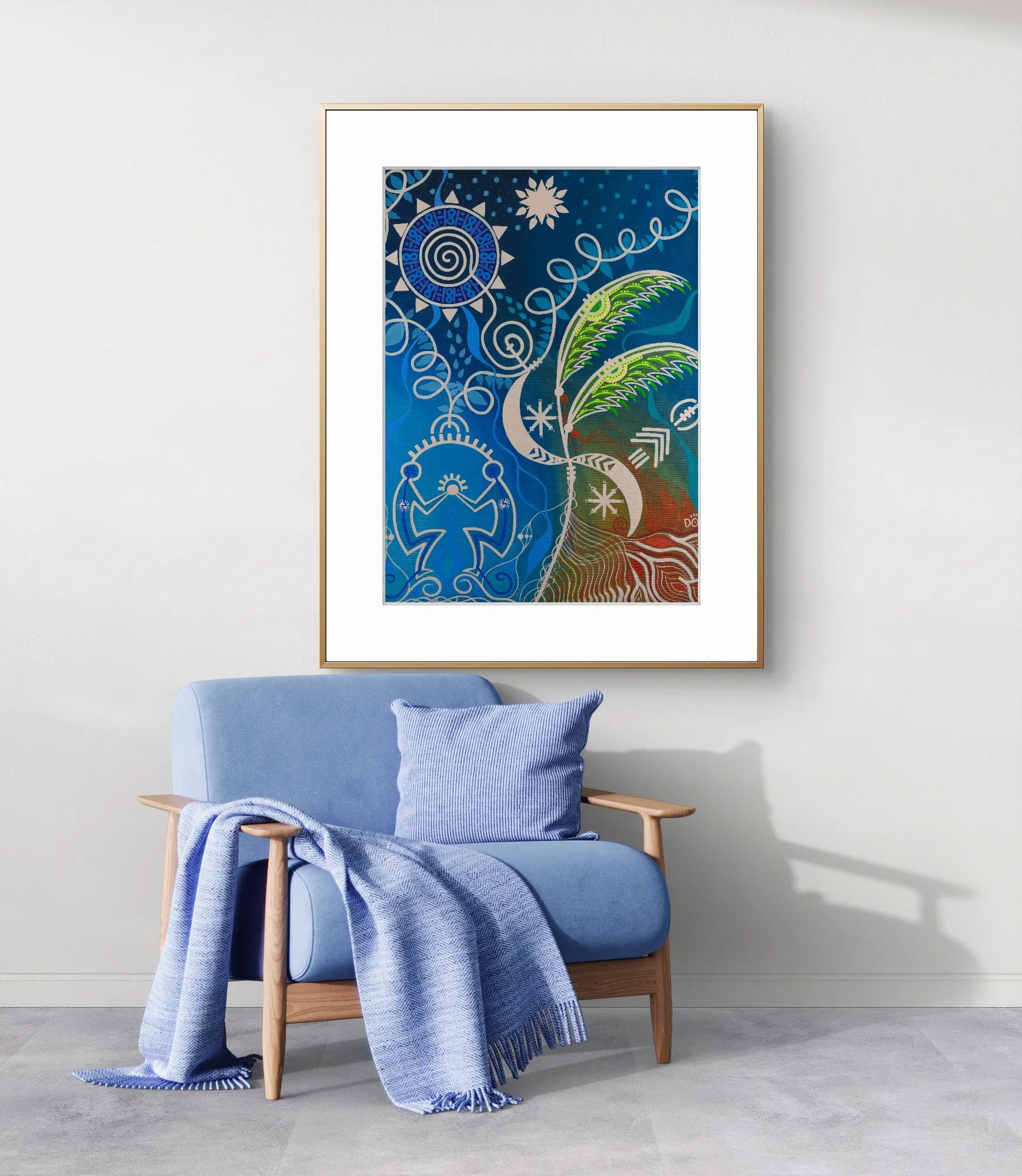 In luminous tones of blue, green, and earthy red, the composition unites cosmic symbols — sun, moon, and stars — with human forms rooted in the earth. It evokes the eternal dance between masculine and feminine, sky and land, spirit and matter.