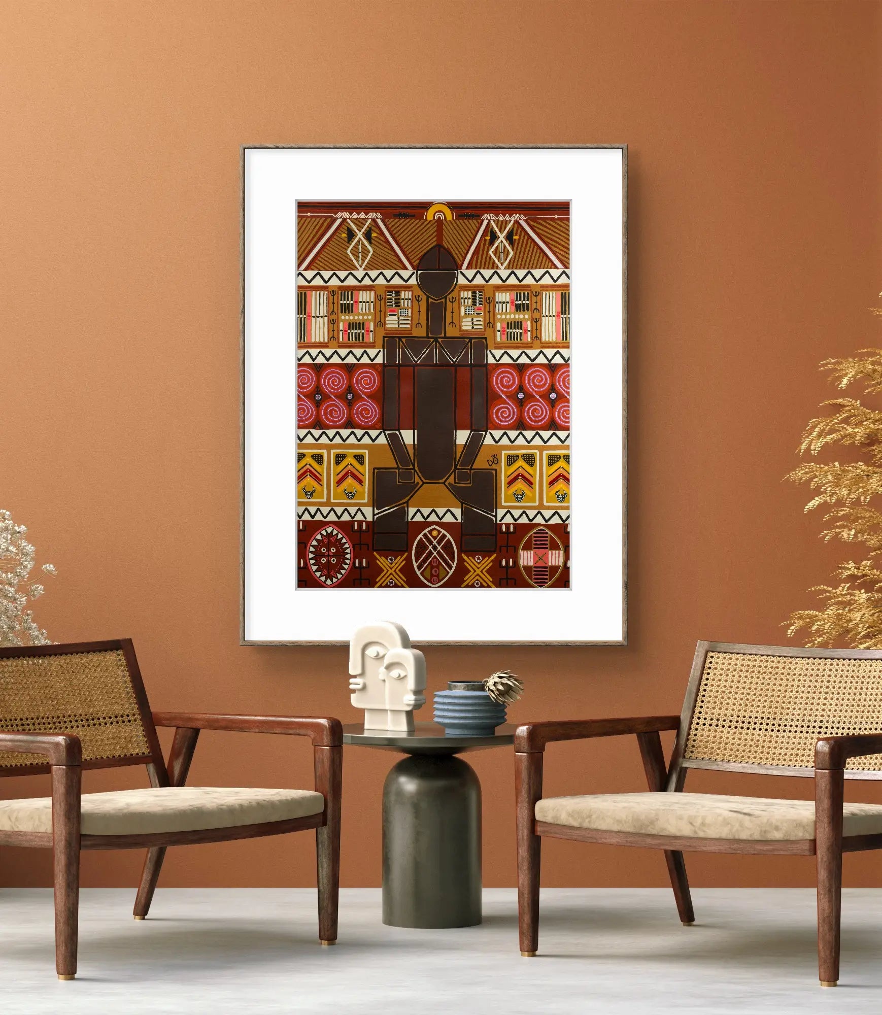 Dans des tons terreux d'ocre, de brun et de rouge, la figure centrale incarne la stabilité et l'ancrage , tandis que les motifs géométriques environnants évoquent l'ordre cosmique, l'équilibre social et les cycles de la vie. Des symboles de fertilité, de protection et de connexion spirituelle s'entremêlent, reflétant la croyance dogon selon laquelle toute chose est liée : l'homme et la nature, la terre et le ciel, le matériel et le spirituel.