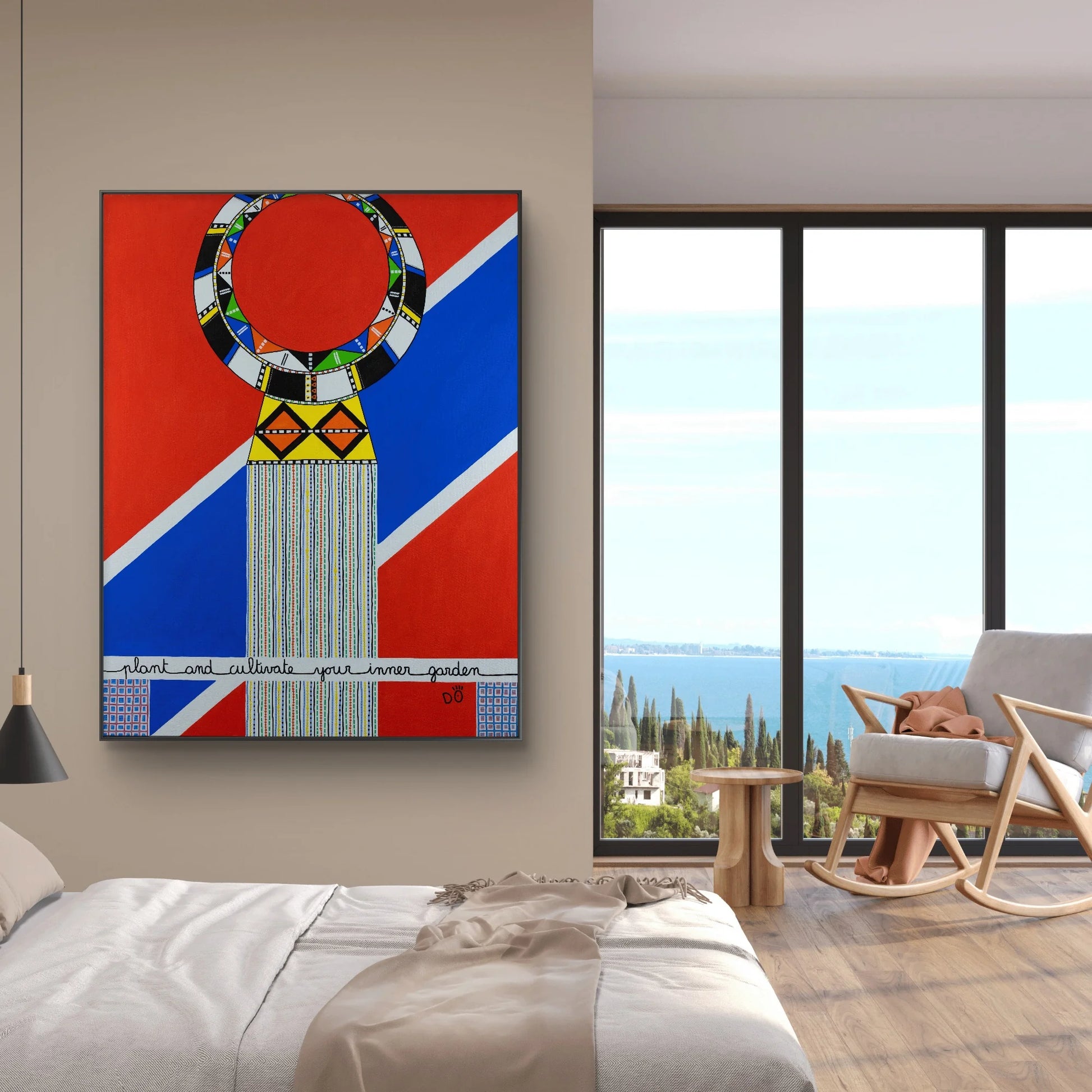 Dans cette œuvre, le rouge éclatant évoque la vitalité et l' ardeur de la vie , tandis que le bleu profond invite à la sérénité et à la vérité intérieure . Les motifs géométriques font écho à la résilience de la sagesse ancestrale, nous rappelant que la croissance naît du respect de nos racines et de notre chemin vers l'avenir .