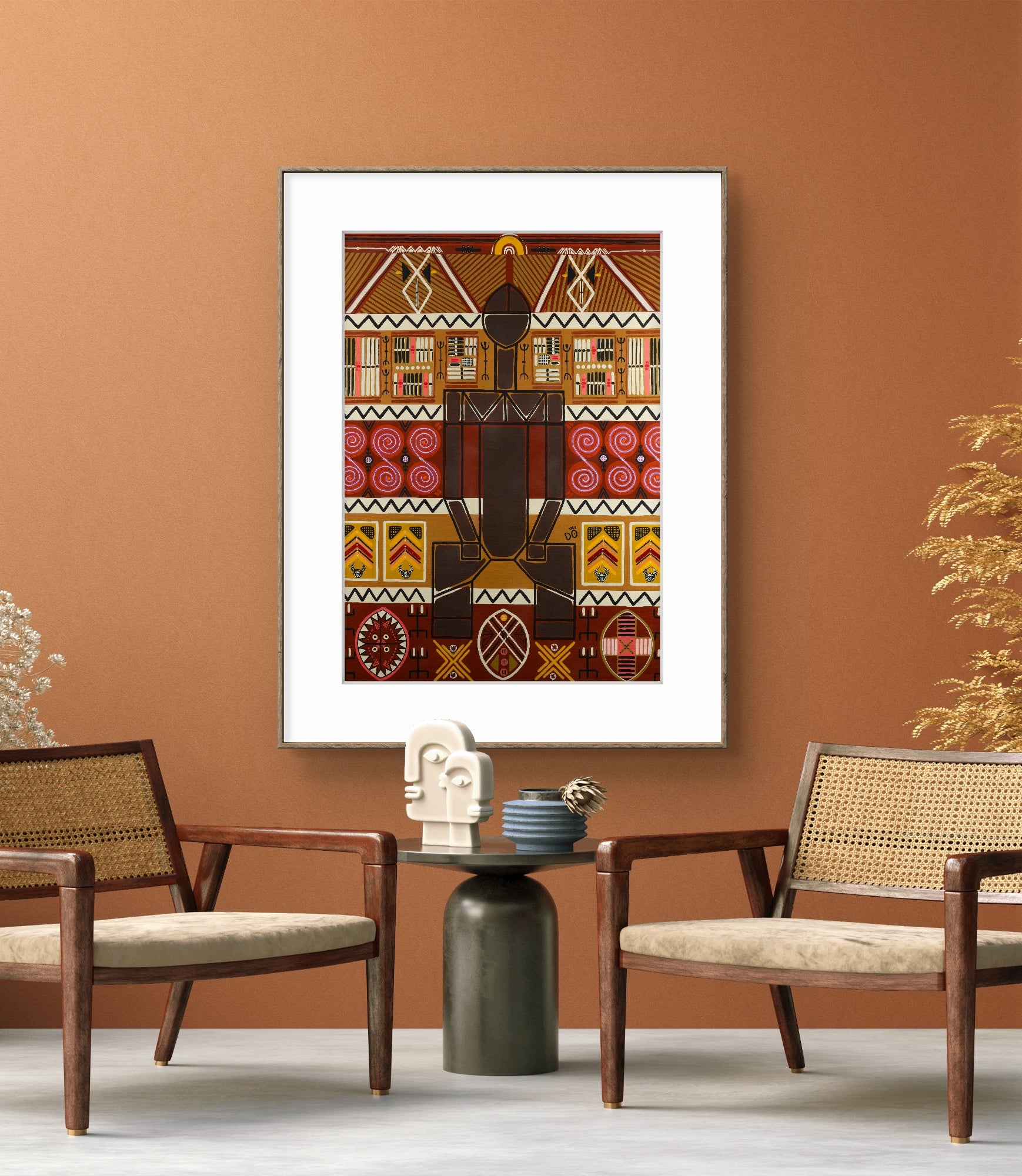 In earthy tones of ochre, brown, and red, the central figure embodies stability and grounding, while the surrounding geometric patterns evoke cosmic order, social balance, and the cycles of life. Symbols of fertility, protection, and spiritual connection are interwoven, reflecting the Dogon belief that all things are linked — man and nature, earth and sky, material and spiritual.