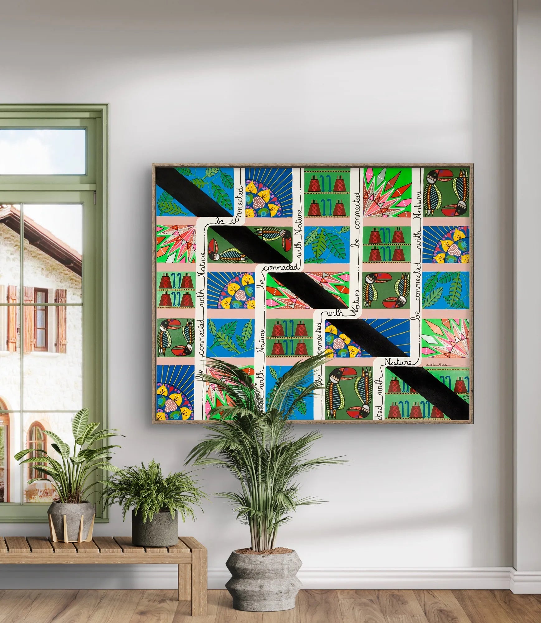 - Stretched on a solid 3.2 cm sustainable wooden frame, resistant to scratches, cracks, and warping.