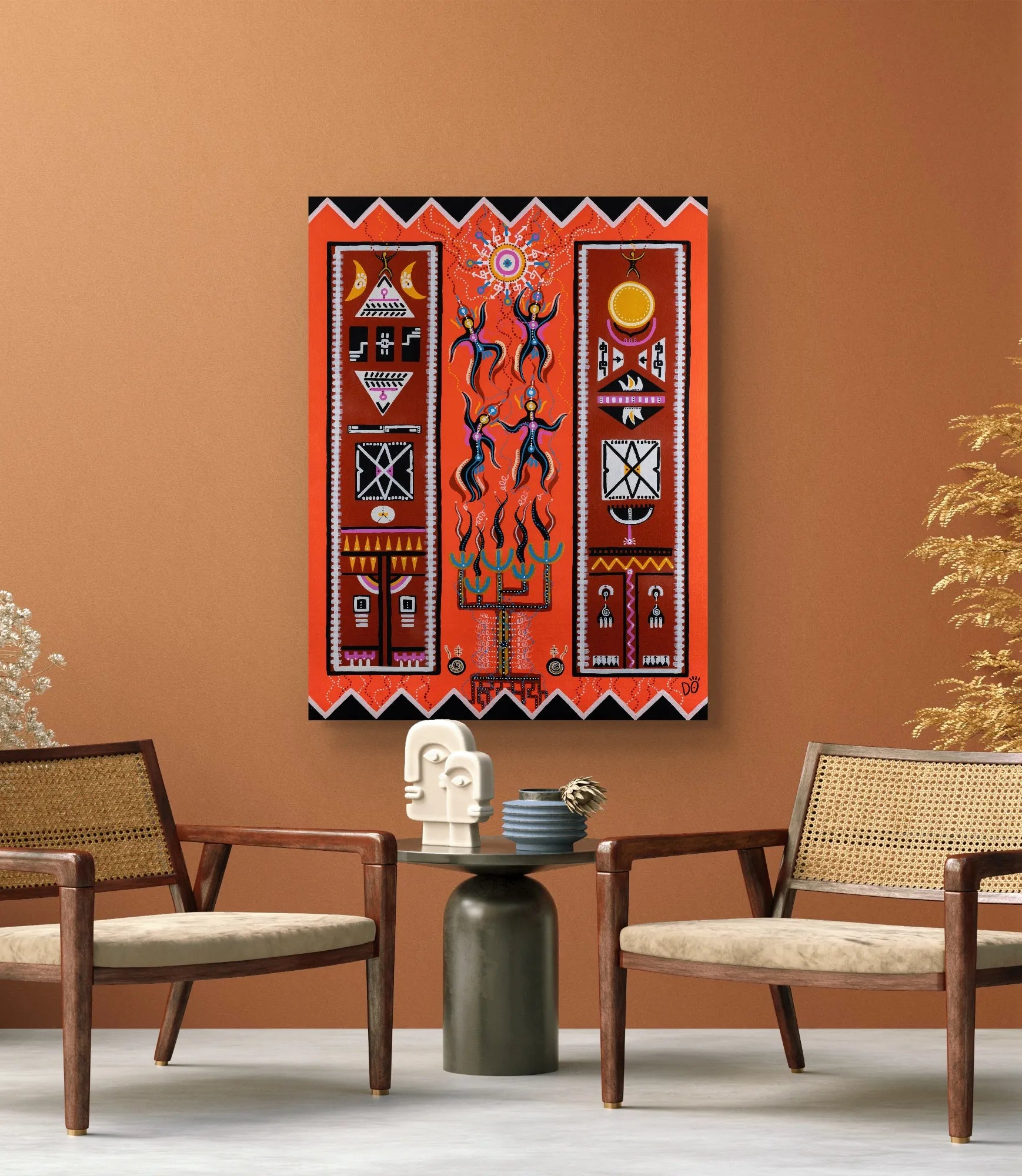 In this vibrant composition, figures rise in movement, embodying joy, fertility, and spiritual elevation. The bright red and orange background radiates vitality, while the geometric motifs recall sacred Dogon symbols — protectors, guides, and reminders of cosmic balance.