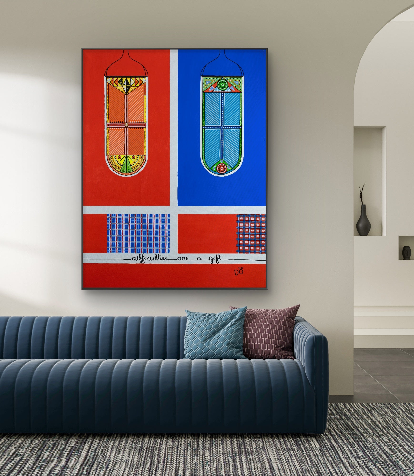 With its bold contrasts and cultural symbolism, this artwork is both a vibrant decorative piece and a mantra for resilience.