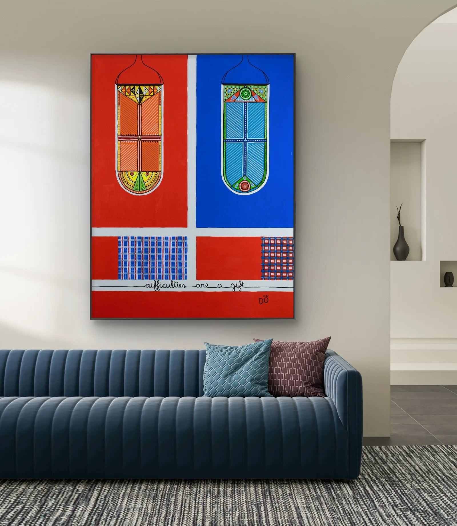 With its bold contrasts and cultural symbolism, this artwork is both a vibrant decorative piece and a mantra for resilience.