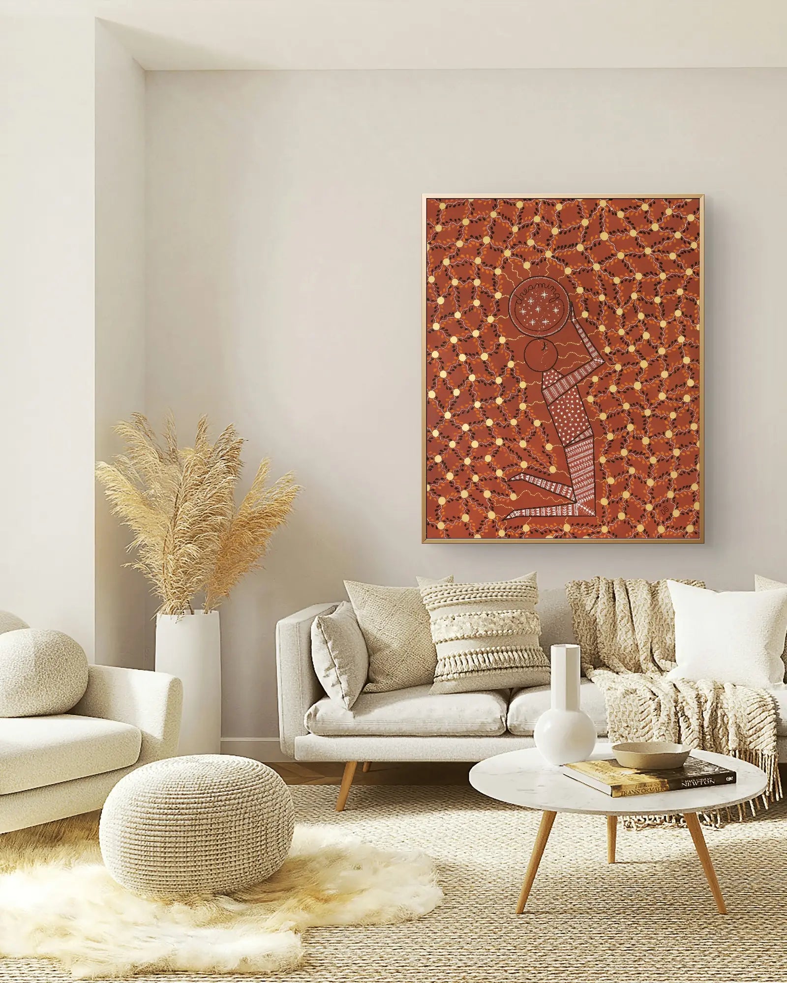 - Stretched on a solid 3.2 cm sustainable wooden frame, resistant to scratches, cracks, and warping.
