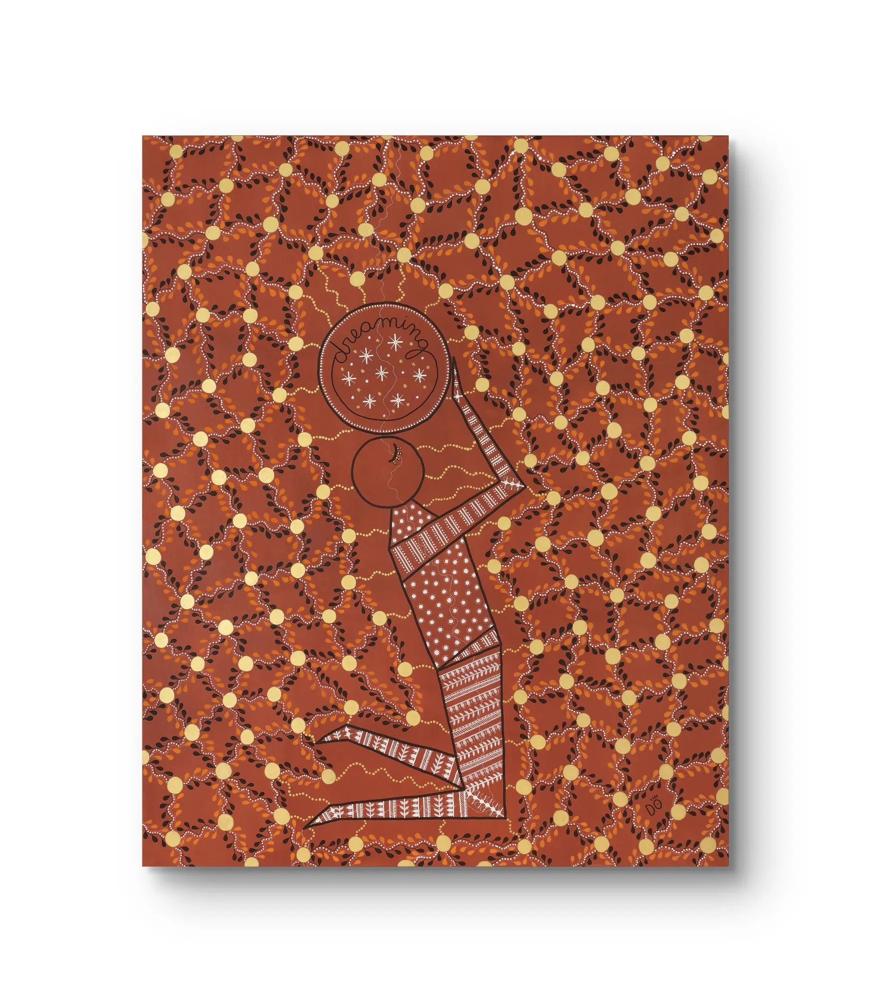 This piece draws inspiration from the Aboriginal concept of Dreamtime (Le Temps du rêve), the sacred origin story of the world. In Aboriginal culture, Dreamtime is the primordial era during which supernatural ancestral beings emerged from the earth or sky to shape the land, animals, and all living things. These beings are intrinsically connected to natural elements—rivers, rocks, trees, and creatures—and continue to live through the land, stories, and traditions passed down through generations.