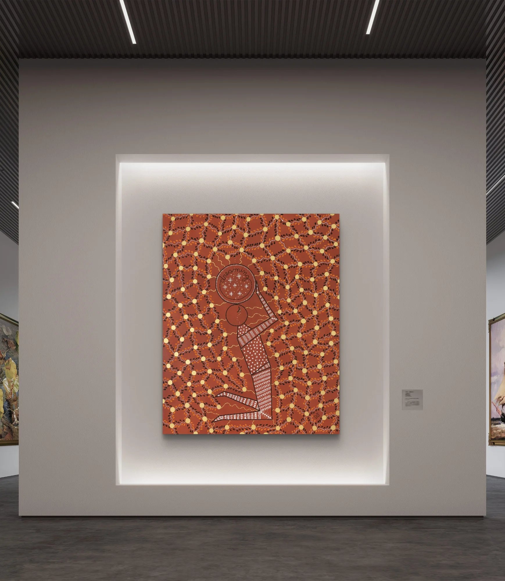 The patterns, textures, and colors echo Aboriginal visual storytelling, where painting becomes a form of transmission—of wisdom, memory, and guidance.