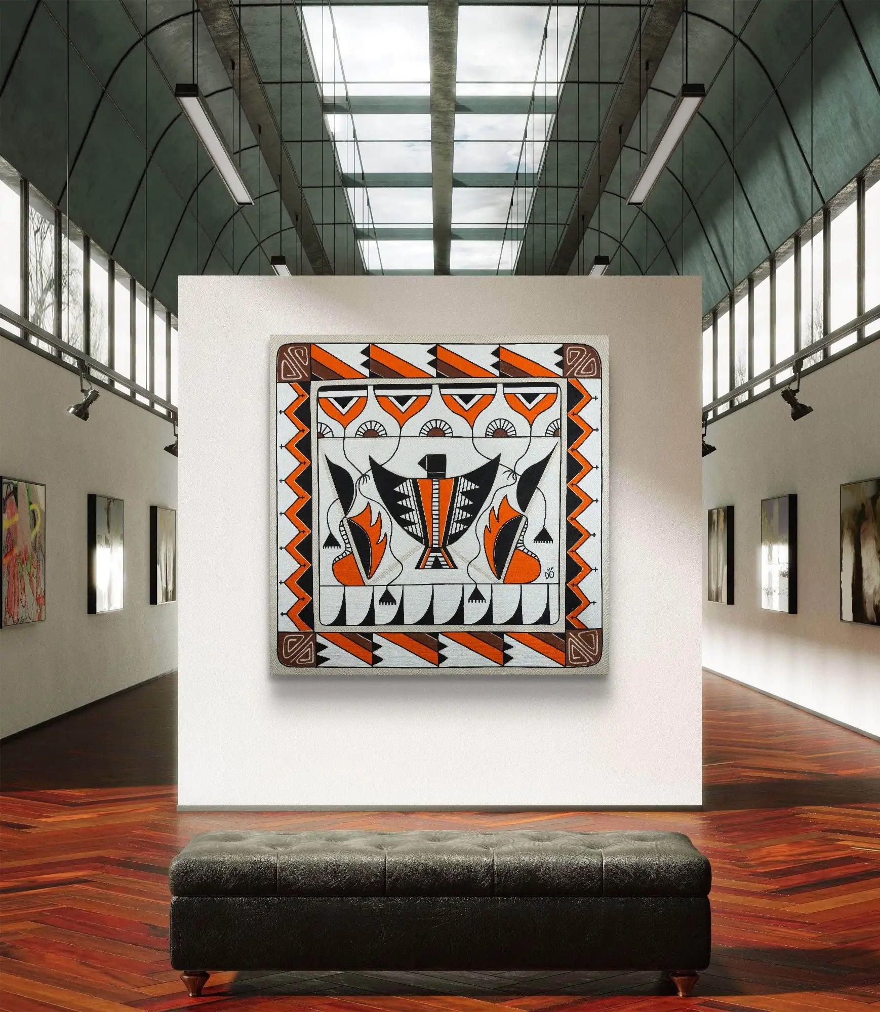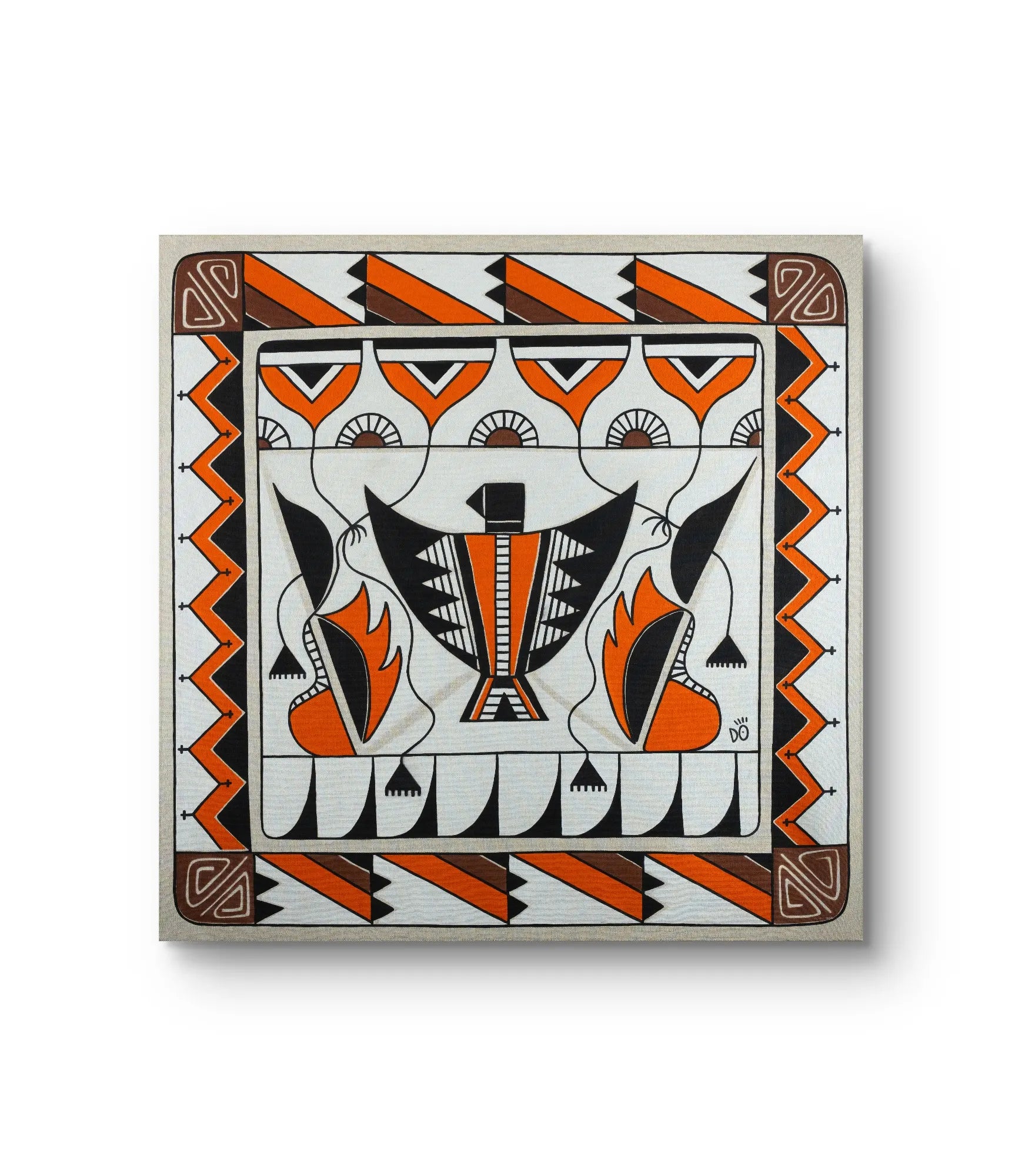 Composed in striking tones of black, orange, and earthy ochre, this work is inspired by the sacred symbolism of flight — the eternal aspiration of the human spirit to rise above its limitations. At the heart of the canvas, a stylized bird opens its wings, embodying both resilience and ascension. Around it, flames and geometric forms recall the vital forces of transformation, while the rhythmic borders echo ancestral traditions and the unbroken chain of cultural memory.
