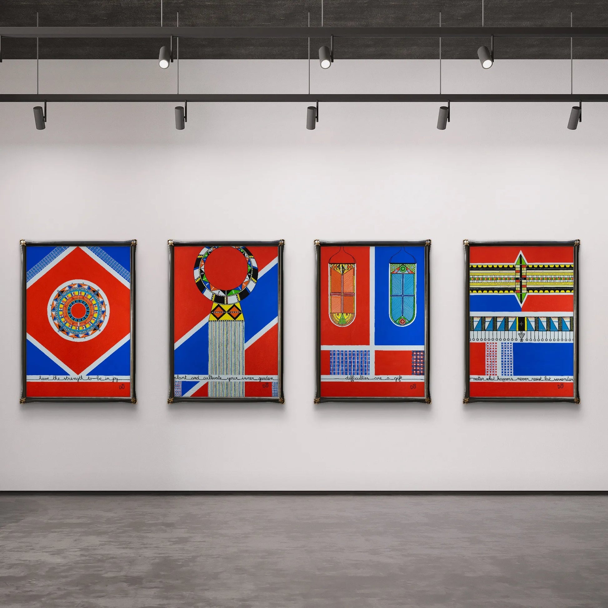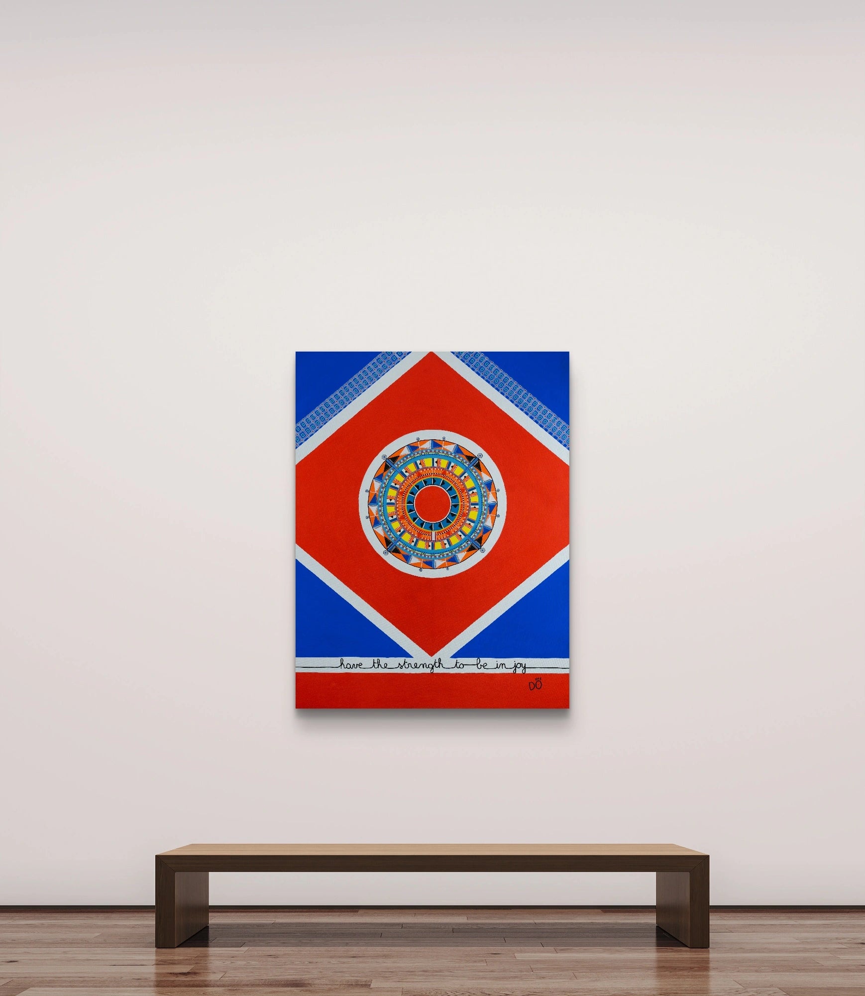 The bold contrasts of red, blue, yellow, and white form an energetic symphony, embodying the dual forces of grounding and transcendence. Beyond its cultural inspiration, this painting becomes a universal meditation on resilience — a reminder that joy is not a passive state but a force to be claimed, cultivated, and defended.