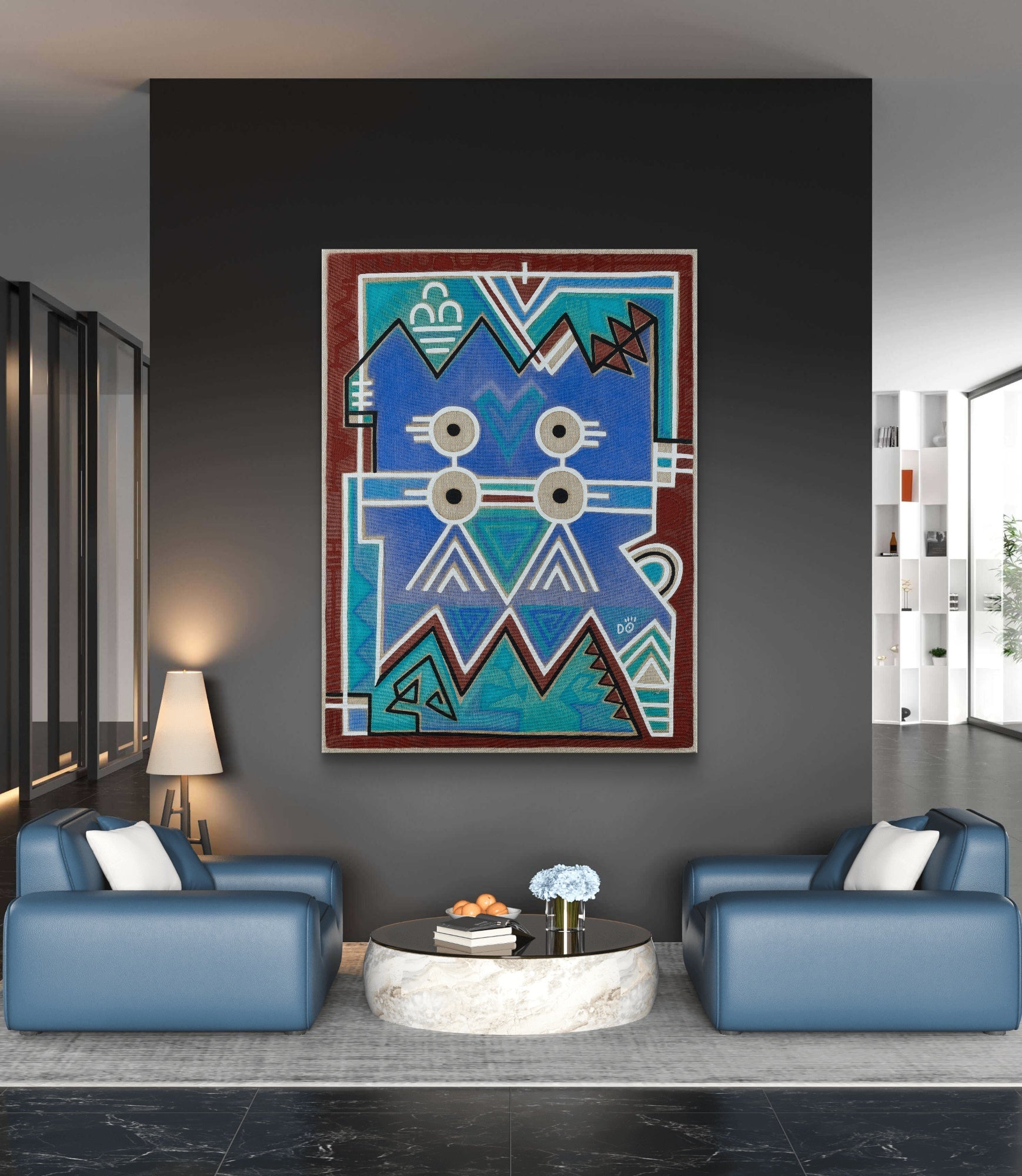 Journey to the Sun is a vibrant path of discovery, where bold blue meets fiery red to reflect the eternal dance between water and fire, calm and energy, earth and sky.