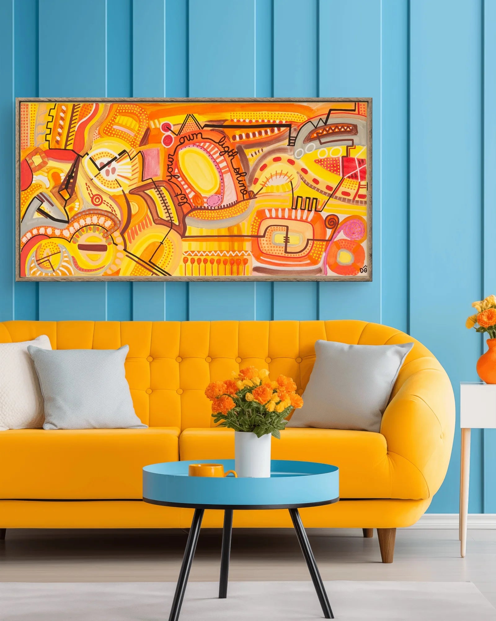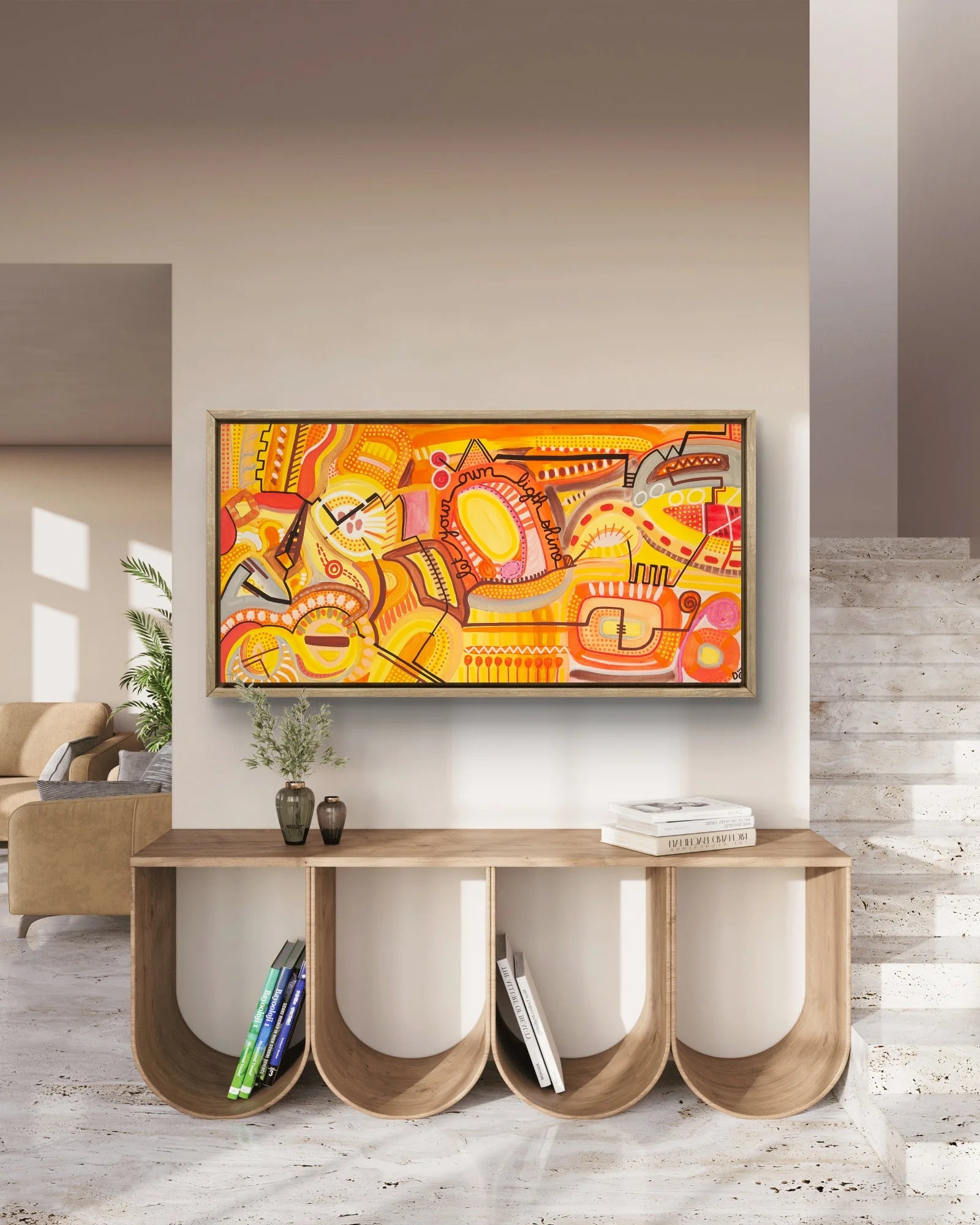 - Stretched on a solid 3.2 cm sustainable wooden frame, resistant to scratches, cracks, and warping.