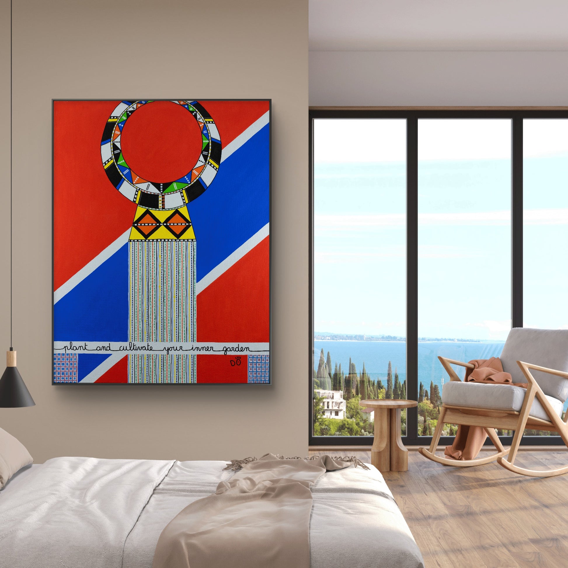 In this artwork, the vibrant red evokes vitality and the fire of life, while the deep blue calls to serenity and inner truth. The geometric patterns echo the resilience of ancestral wisdom, reminding us that growth comes when we honor both our roots and our path forward.