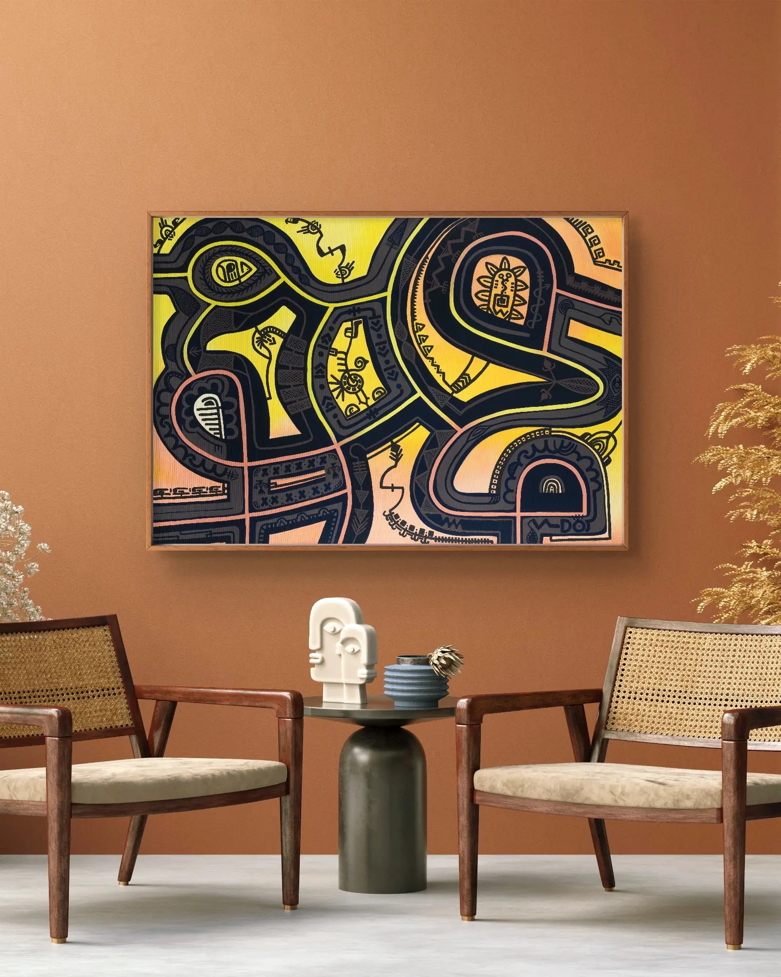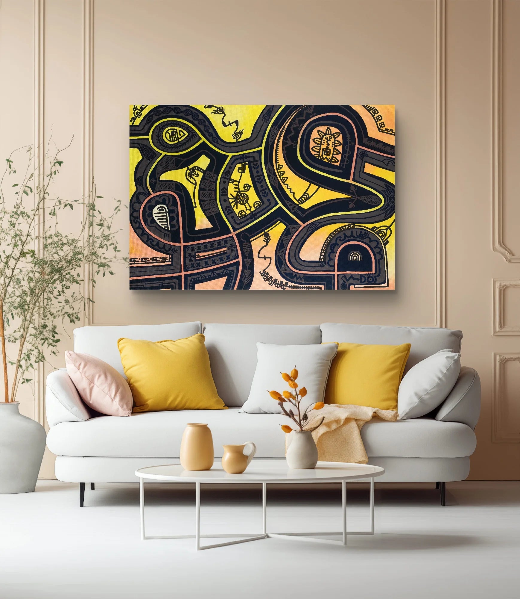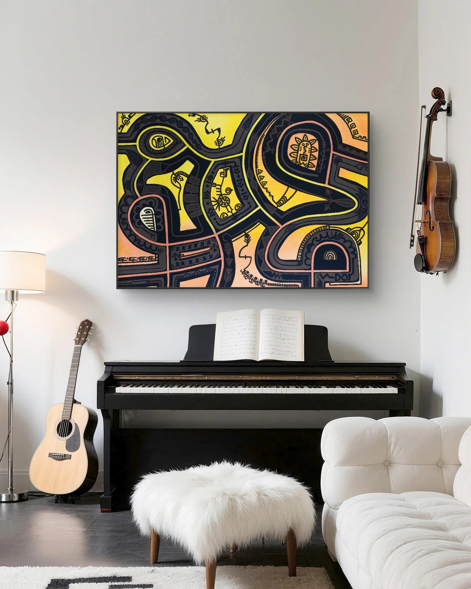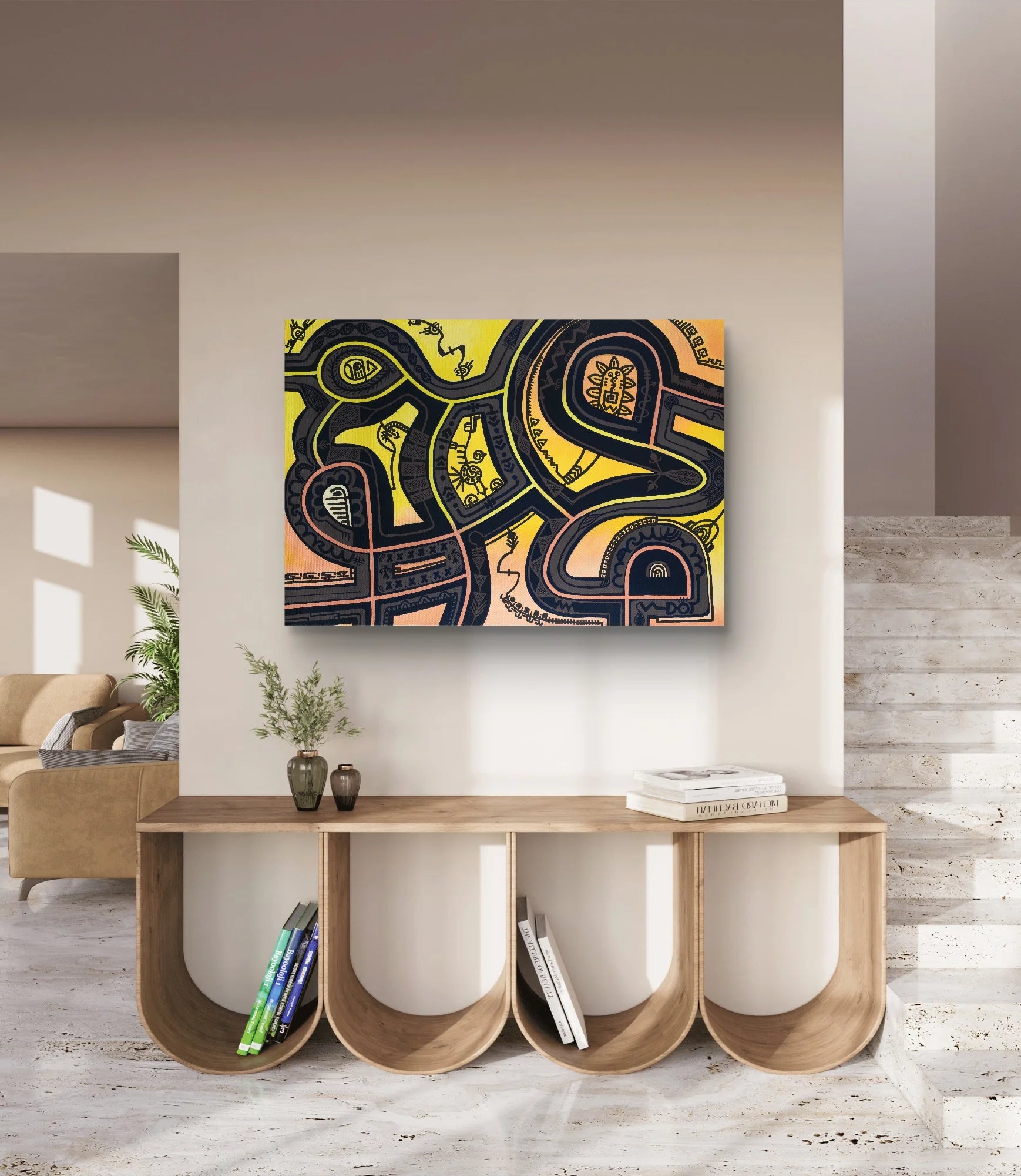 Through bold strokes of black on radiant yellows and warm gradients, this artwork tells the story of survival, of facing shadows, and of transforming them into renewal.