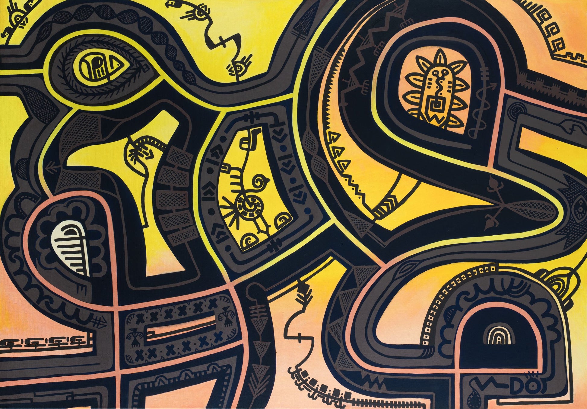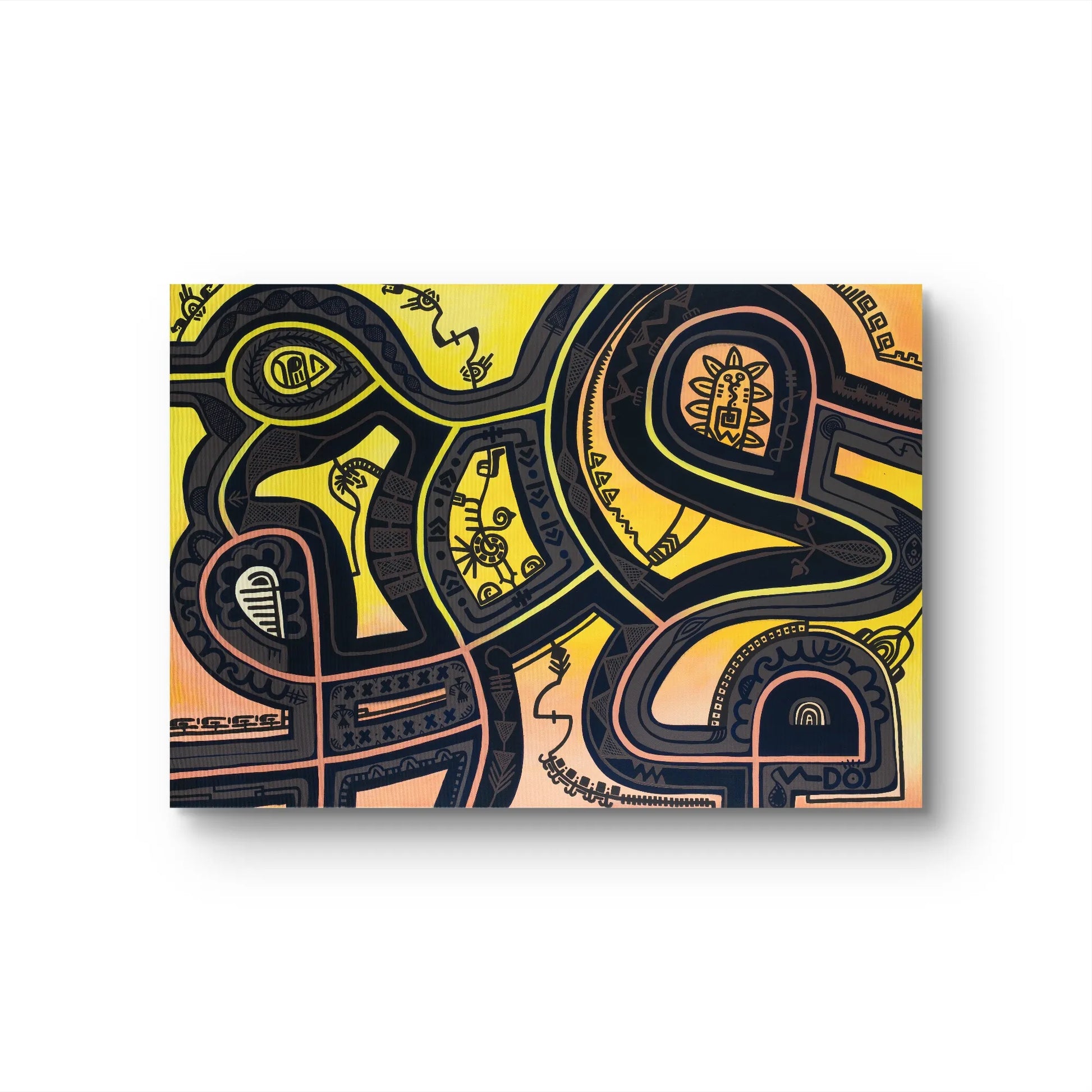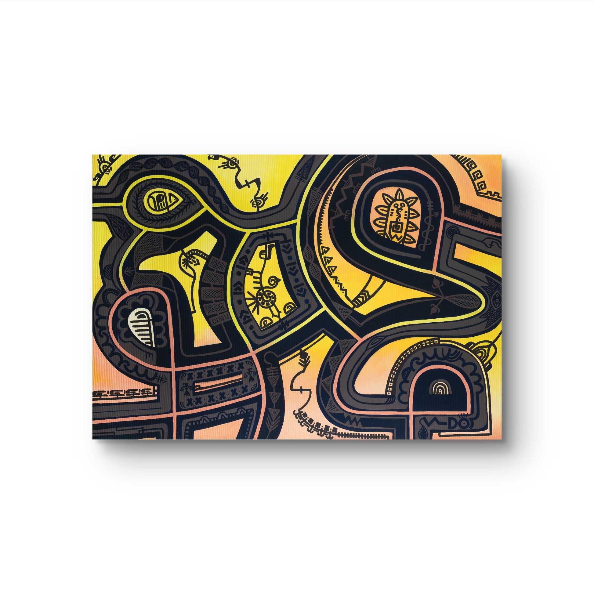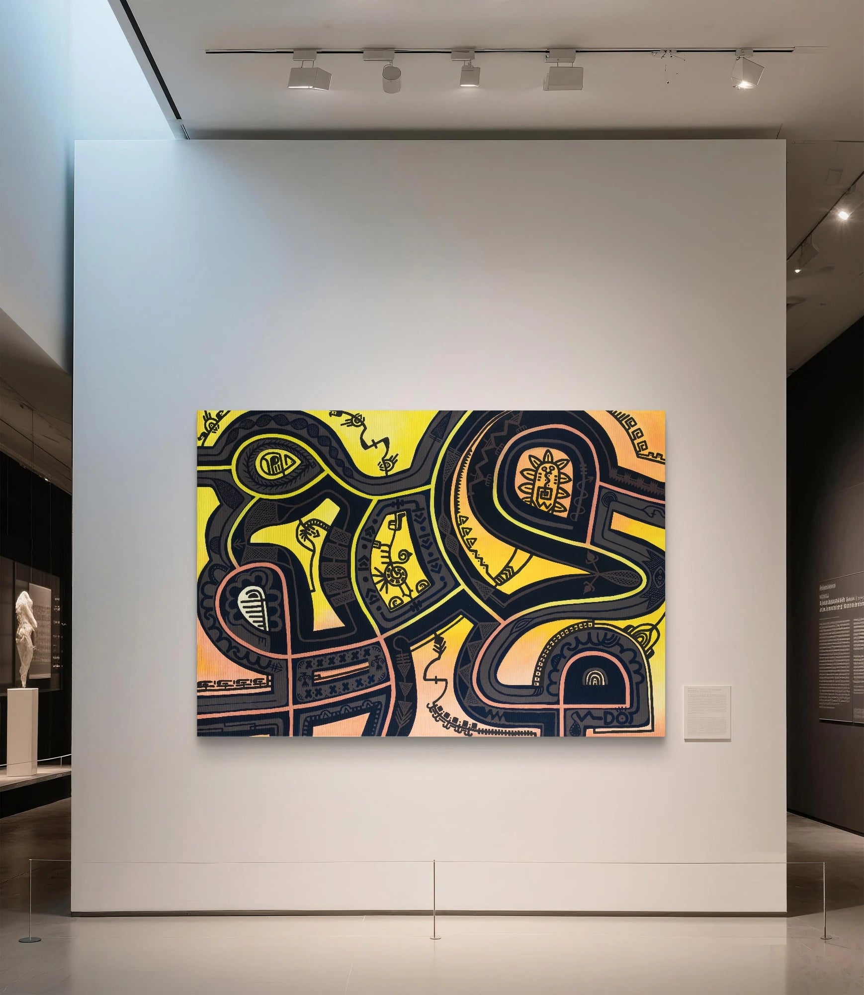 Rebirth is a striking original painting that captures the timeless cycle of endings and new beginnings. With deep contrasts of luminous yellow, earthy black, and subtle peach tones, the composition evokes both the mystery of the shadows and the vitality of the rising sun.