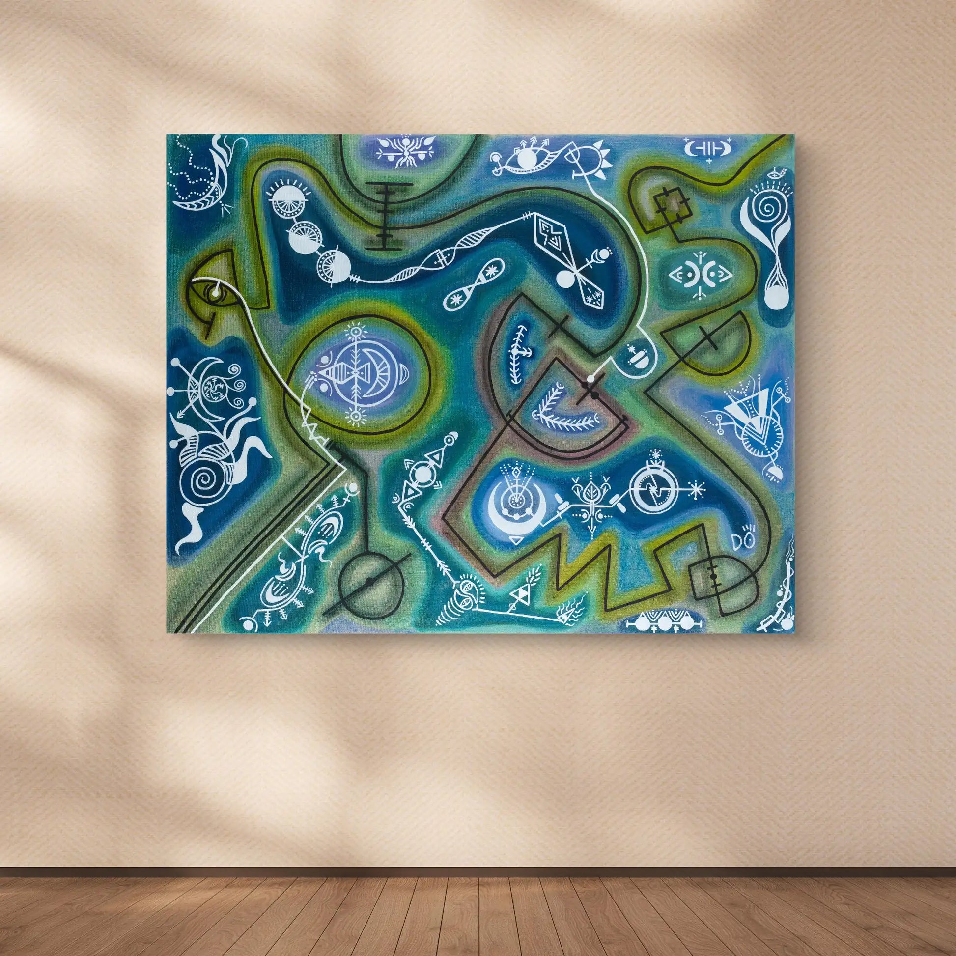 The Music of the Moon is a contemplative work where lunar rhythms meet human imagination. In deep shades of blue and green, punctuated with subtle luminous symbols, the painting evokes the eternal dialogue between the moon and the soul. The abstract forms, reminiscent of ancestral glyphs, trace invisible paths — those of cycles, dreams, and inner transformations.